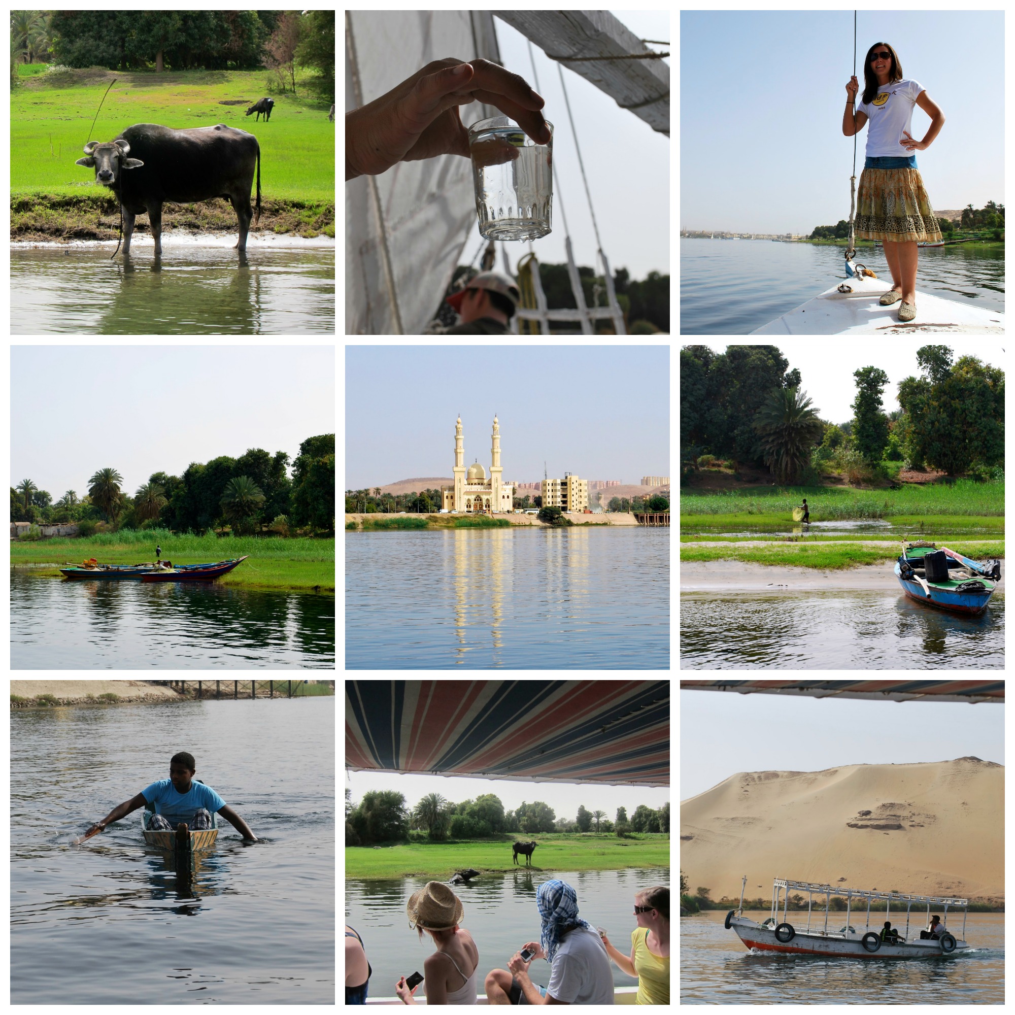 One of our excursions from our boat was to take a felucca and sail around on the Nile. We were quite surprised at just how clean the Nile River is. Our tour guide demonstrated by taking a clear class and dunking it underwater and pulling it out. The glass of water looked like it had been poured from a bottle of Evian; pristine clear without any dirt particles. Amazing! Still…much like Mexico, our stomachs weren’t prepared to drink the water… but for locals, ancient and modern, the Nile has served as a great source of drinking water.