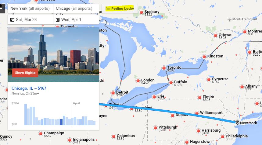Google has an awesome “I’m feeling Lucky” feature. On the main page of Google Flights, select the map. From the map page, enter in your departure airport. You will then be able to see a listing of major cities and the related prices to get there. Are you feeling lucky? Click the “I’m feeling lucky” button next to the destination box. Google will suggest a flight deal based on your departure city. Pretty cool right?! You’ll also see a diagram underneath your selected city that indicates which days may be cheaper to fly on should you be so flexible.